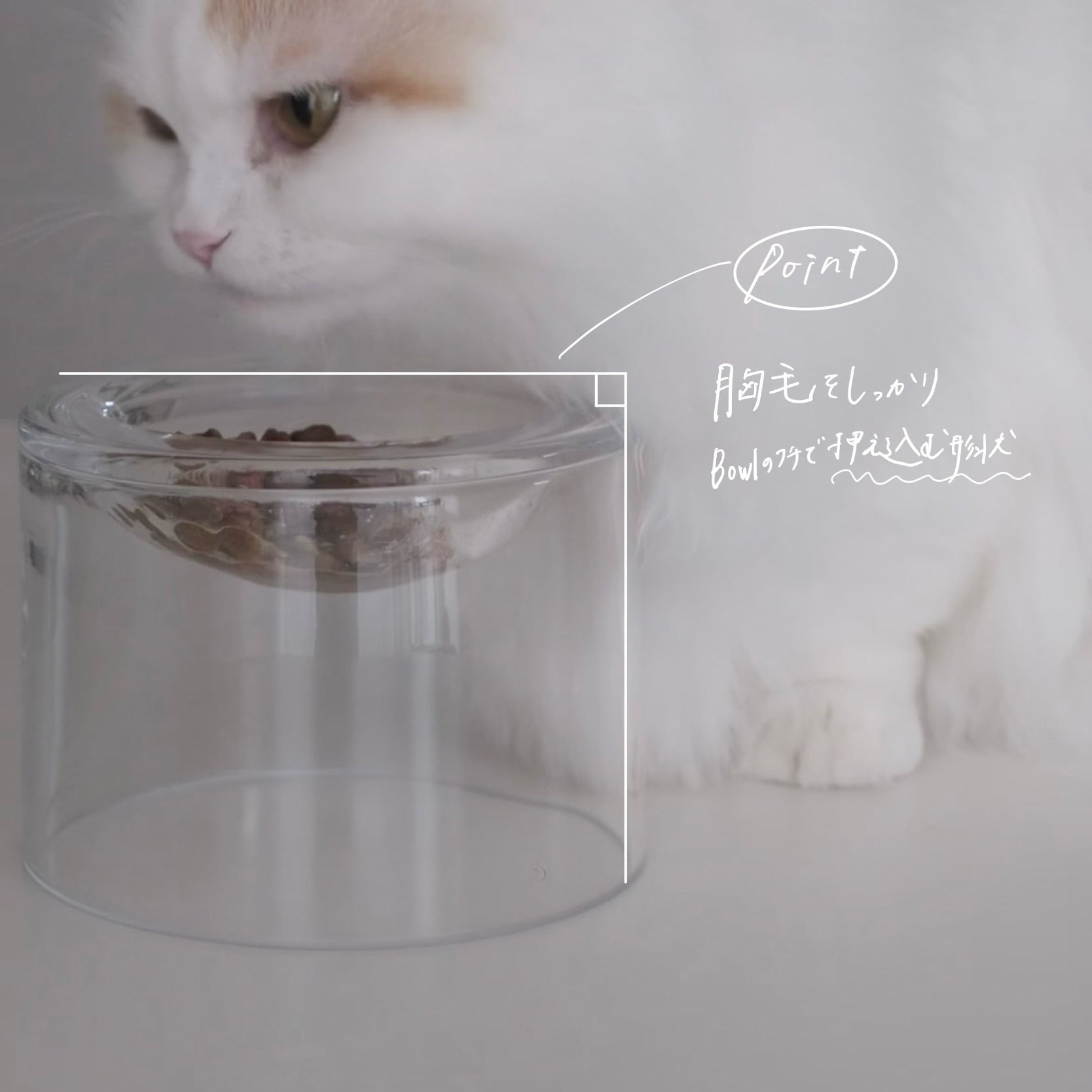 必ず毛濡れを起こす我が家の長毛猫からヒントをもらい、フードボウルの縁は幅広の2㎝を確保。